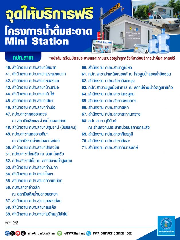 ผู้ว่าการ กปภ. กล่าวเพิ่มเติมว่า โครงการน้ำดื่มสะอาดของ กปภ. ไม่เพียงช่วยลดค่าใช้จ่ายในการซื้อน้ำดื่มของประชาชนในชีวิตประจำวัน แต่ยังส่งเสริมให้ประชาชนเข้าถึงน้ำดื่มสะอาดได้อย่างทั่วถึง ตลอดจนมีส่วนช่วยลดการใช้พลาสติกแบบใช้ครั้งเดียวทิ้ง ซึ่งเป็นประโยชน์ต่อสิ่งแวดล้อม กปภ. จะยังคงเดินหน้าพัฒนาการให้บริการอย่างต่อเนื่อง เพื่อให้สอดคล้องกับความต้องการของประชาชนต่อไป ทั้งนี้ หากประชาชนไม่ได้รับความสะดวกในการใช้บริการน้ำประปา หรือ ต้องการสอบถามข้อมูลเพิ่มเติมสามารถติดต่อได้ที่ PWA Contact Center 1662 ตลอด 24 ชั่วโมง