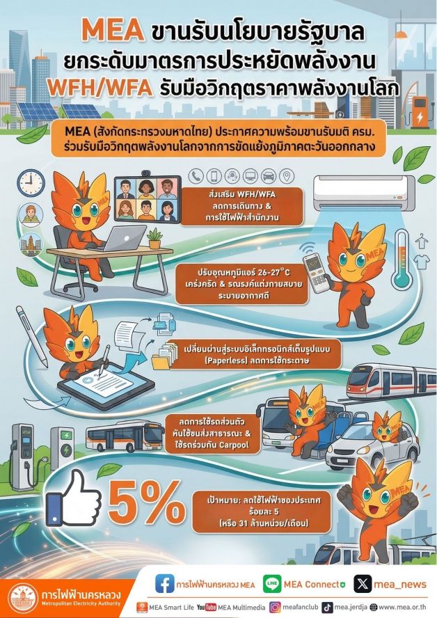 MEA หรือการไฟฟ้านครหลวง ในฐานะรัฐวิสาหกิจสังกัดกระทรวงมหาดไทย ประกาศความพร้อมขานรับนโยบายรัฐบาลและมติคณะรัฐมนตรี เพื่อร่วมรับมือกับสถานการณ์ความขัดแย้งในภูมิภาคตะวันออกกลางที่ส่งผลกระทบต่อโครงสร้างพื้นฐานและแหล่งผลิตน้ำมันดิบ ซึ่งนำไปสู่ความเสี่ยงด้านวิกฤตพลังงานและความผันผวนของราคาพลังงานทั่วโลก โดย MEA พร้อมทำหน้าที่เป็นหน่วยงานภาครัฐต้นแบบในการดำเนินมาตรการประหยัดพลังงานอย่างเข้มงวด ทั้งการส่งเสริมให้บุคลากรทำงานจากบ้าน (Work From Home) หรือทำงานจากทุกที่ที่มีความสะดวก (Work From Anywhere) เพื่อลดการใช้พลังงานในภาคขนส่งและลดการใช้ไฟฟ้าในอาคารสำนักงานอย่างเป็นรูปธรรมตามแนวทางของภาครัฐ