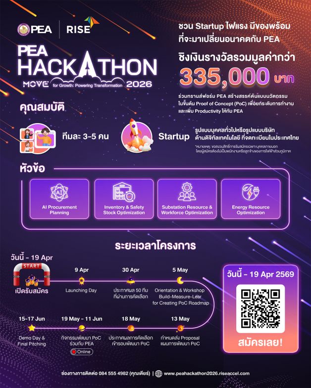 #PEAHackathon2026 #MOVEforGrowth #PoweringTransformation #PEA #การไฟฟ้าส่วนภูมิภาค #RISE #Hackathon #CorporateInnovation #EnergyInnovation #TechStartup #DigitalTransformation