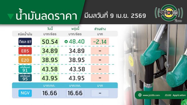 ผู้ค้าน้ำมันแจ้งปรับราคาน้ำมันขายปลีก มีผลวันที่ 9 เม.ย. 69 เวลา 05.00 น. สำหรับราคาใหม่ในเขตกรุงเทพมหานครและปริมณฑล วันพรุ่งนี้จะเป็นดังนี้