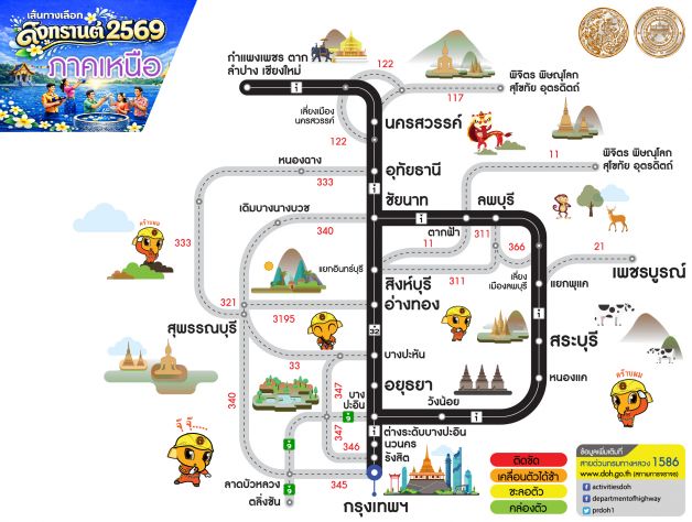 กรมทางหลวง โดยสำนักอำนวยความปลอดภัย ได้แนะนำเส้นทางเลือกให้กับประชาชนในช่วงเทศกาลสงกรานต์ ระหว่างวันที่ 10 เมษายน 2569 – 19 เมษายน 2569 เพื่อเป็นการอำนวยความสะดวกแก่ผู้เดินทางและหลีกเลี่ยงปัญหาการจราจรติดขัด รวมถึงช่วยให้ประชาชนสามารถวางแผนการเดินทางล่วงหน้าได้อย่างมีประสิทธิภาพบนทางหลวงสายหลักและสายรอง ดังนี้