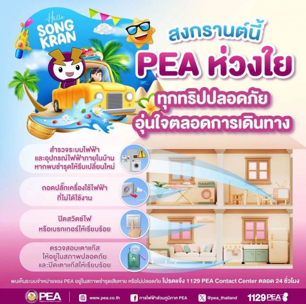 การไฟฟ้าส่วนภูมิภาค (PEA) ห่วงใยประชาชนในช่วงเทศกาลสงกรานต์ซึ่งเป็นวันหยุดยาวที่ประชาชนส่วนใหญ่เดินทางกลับภูมิลำเนาและท่องเที่ยวต่างจังหวัด เพื่อความปลอดภัยในชีวิตและทรัพย์สิน PEA ขอแนะนำให้ตรวจสอบความเรียบร้อยของระบบไฟฟ้าและอุปกรณ์ภายในบ้านก่อนออกเดินทาง ดังนี้