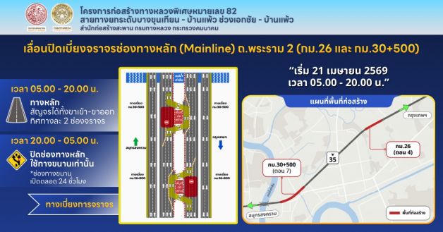 กรมทางหลวง โดยสำนักก่อสร้างสะพาน ขอแจ้งปรับกำหนดการปิดเบี่ยงจราจรช่องทางหลักบริเวณ กม.26 และ กม.30+500 บนทางหลวงหมายเลข 35 (ถนนพระราม 2) เพื่อเตรียมความพร้อมในการยกติดตั้งชิ้นส่วนโครงสร้างทางยกระดับ (M82) ในส่วนที่เหลือ จากเดิมวันที่ 20 เมษายน 2569 เป็นวันที่ 21 เมษายน 2569