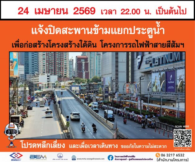 ในการนี้ รฟม. ขอแนะนำให้ประชาชนผู้สัญจรผ่านเส้นทางดังกล่าวเผื่อเวลาเดินทาง โดยเฉพาะในช่วงแรกของการปิดสะพาน และศึกษาเส้นทางเลี่ยง เช่น การใช้ทางพิเศษศรีรัช ถนนศรีอยุธยา หรือถนนพระรามที่ 1 เป็นต้น รวมถึงพิจารณาทางเลือกในการใช้บริการขนส่งสาธารณะเพื่อหลีกเลี่ยงการจราจรติดขัดในระหว่างที่มีการก่อสร้าง โดยหากไม่จำเป็นโปรดหลีกเลี่ยงพื้นที่ก่อสร้างดังกล่าว และ รฟม. ต้องขออภัยในความไม่สะดวกมา ณ โอกาสนี้ โดยผู้ใช้เส้นทางสามารถสอบถามรายละเอียดการเบี่ยงจราจรได้ที่หมายเลข 06 3217 6532 และติดตามข้อมูลโครงการฯ เพิ่มเติมได้ที่เว็บไซต์โครงการรถไฟฟ้าสายสีส้ม ช่วงบางขุนนนท์ - ศูนย์วัฒนธรรมแห่งประเทศไทย (www.mrta-orangelinewest.com) Facebook โครงการรถไฟฟ้าสายสีส้ม ช่วงบางขุนนนท์ – ศูนย์วัฒนธรรมแห่งประเทศไทย Tiktok @orangeline.pr