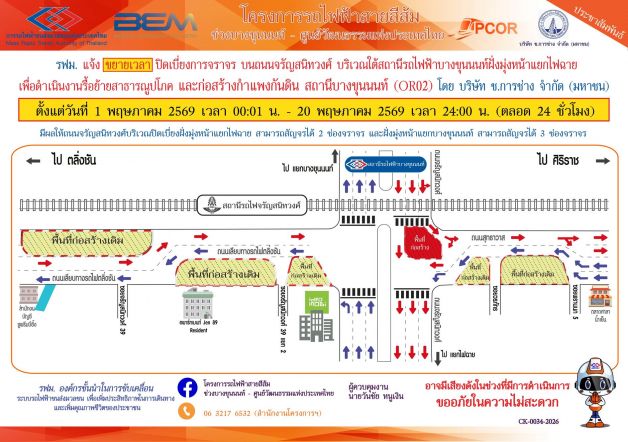 การรถไฟฟ้าขนส่งมวลชนแห่งประเทศไทย (รฟม.) แจ้งว่า บริษัท ช.การช่าง จำกัด (มหาชน) ผู้รับจ้างออกแบบและก่อสร้างอุโมงค์ทางวิ่งและสถานีใต้ดิน โครงการรถไฟฟ้าสายสีส้ม ช่วงบางขุนนนท์ – ศูนย์วัฒนธรรม แห่งประเทศไทย มีความจำเป็นต้องขยายเวลาปิดเบี่ยงการจราจร 2 ช่องจราจร บนถนนจรัญสนิทวงศ์ บริเวณใต้สถานีรถไฟฟ้าบางขุนนนท์ฝั่งมุ่งหน้าแยกไฟฉายเพื่อดำเนินงานรื้อย้ายสาธารณูปโภค และก่อสร้างกำแพงกันดิน สถานีบางขุนนนท์ (OR02) ตั้งแต่วันที่ 1 พฤษภาคม 2569 เวลา 00:01 น. – 20 พฤษภาคม 2569 เวลา 24:00 น. (ตลอด 24 ชั่วโมง) มีผลให้ถนนจรัญสนิทวงศ์บริเวณปิดเบี่ยงฝั่งมุ่งหน้าแยกไฟฉาย สามารถสัญจรได้ 2 ช่องจราจร และฝั่งมุ่งหน้าแยกบางขุนนนท์ สามารถสัญจรได้ 3 ช่องจราจร โดยประชาชนสามารถเข้า – ออกที่พักอาศัยได้ตามปกติ