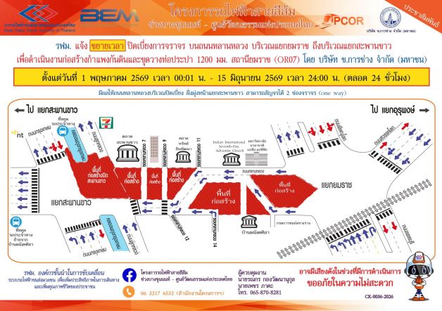 การรถไฟฟ้าขนส่งมวลชนแห่งประเทศไทย (รฟม.) แจ้งว่า บริษัท ช.การช่าง จำกัด (มหาชน) ผู้รับจ้างออกแบบและก่อสร้างอุโมงค์ทางวิ่งและสถานีใต้ดิน โครงการรถไฟฟ้าสายสีส้ม ช่วงบางขุนนนท์ - ศูนย์วัฒนธรรมแห่งประเทศไทย มีความจำเป็นต้องขยายเวลาปิดเบี่ยงการจราจร 3 ช่องจราจร บนถนนหลานหลวง บริเวณแยกยมราช ถึงบริเวณแยกสะพานขาว เพื่อดำเนินงานก่อสร้างกำแพงกันดินและขุดวางท่อประปา 1200 มม. สถานียมราช (OR07) ตั้งแต่วันที่ 1 พฤษภาคม 2569 เวลา 00:01 น. – 15 มิถุนายน 2569 เวลา 24:00 น. (ตลอด 24 ชั่วโมง)