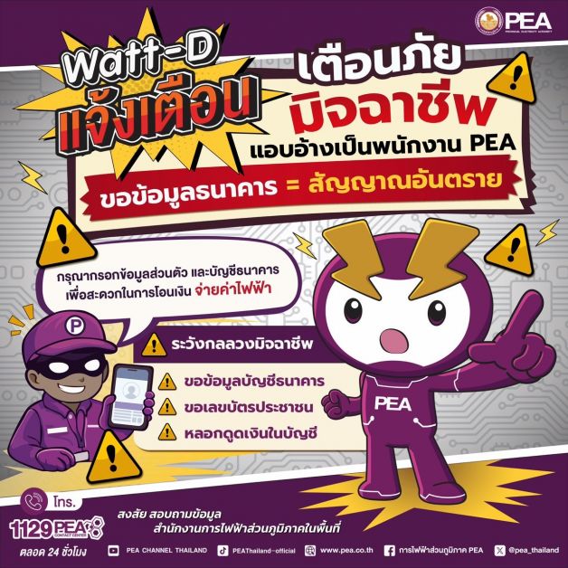 Watt-D แจ้งเตือน ระวัง !!! อย่าให้ข้อมูลบัญชีธนาคาร เลขบัตรประชาชน หากมีคนแอบอ้างเป็นพนักงาน PEA