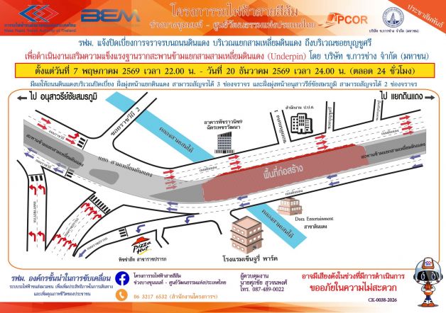 การรถไฟฟ้าขนส่งมวลชนแห่งประเทศไทย (รฟม.) แจ้งว่า บริษัท ช.การช่าง จำกัด (มหาชน) ผู้รับจ้างออกแบบและก่อสร้างอุโมงค์ทางวิ่งและสถานีใต้ดิน โครงการรถไฟฟ้าสายสีส้ม ช่วงบางขุนนนท์ – ศูนย์วัฒนธรรมแห่งประเทศไทย มีความจำเป็นต้องปิดเบี่ยงการจราจรบนถนนดินแดง 1 ช่องจราจรชิดเกาะกลาง บริเวณแยกสามเหลี่ยมดินแดง ถึงบริเวณซอยบุญชูศรี เพื่อดำเนินงานเสริมความแข็งแรงฐานรากสะพานข้ามแยกสามเหลี่ยมดินแดง (Underpin) ตั้งแต่วันที่ 7 พฤษภาคม 2569 เวลา 22.00 น. – 20 ธันวาคม 2569 เวลา 24.00 น. (ตลอด 24 ชั่วโมง) มีผลให้ถนนดินแดงบริเวณปิดเบี่ยง ฝั่งมุ่งหน้าแยกดินแดง สามารถสัญจรได้ 3 ช่องจราจร และฝั่งมุ่งหน้าอนุสาวรีย์ชัยสมรภูมิ สามารถสัญจรได้ 2 ช่องจราจร โดยประชาชนสามารถเข้า – ออกที่พักอาศัยได้ตามปกติ