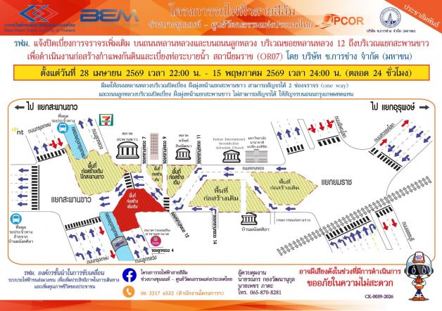 การรถไฟฟ้าขนส่งมวลชนแห่งประเทศไทย (รฟม.) แจ้งว่า บริษัท ช.การช่าง จำกัด (มหาชน) ผู้รับจ้างออกแบบและก่อสร้างอุโมงค์ทางวิ่งและสถานีใต้ดิน โครงการรถไฟฟ้าสายสีส้ม ช่วงบางขุนนนท์ – ศูนย์วัฒนธรรมแห่งประเทศไทย มีความจำเป็นต้องปิดเบี่ยงการจราจรเพิ่มเติม บนถนนหลานหลวงและบนถนนลูกหลวง บริเวณซอยหลานหลวง 12 ถึงบริเวณแยกสะพานขาว เพื่อดำเนินงานก่อสร้างกำแพงกันดินและเบี่ยงท่อระบายน้ำ สถานียมราช (OR07) ตั้งแต่วันที่ 28 เมษายน 2569 เวลา 22:00 น. – 15 พฤษภาคม 2569 เวลา 24:00 น. (ตลอด 24 ชั่วโมง) มีผลให้ถนนหลานหลวงบริเวณปิดเบี่ยง ฝั่งมุ่งหน้าแยกสะพานขาว สามารถสัญจรได้ 2 ช่องจราจร (one way) และถนนลูกหลวงบริเวณปิดเบี่ยง ฝั่งมุ่งหน้าแยกสะพานขาว ไม่สามารถสัญจรได้ ให้สัญจรบนถนนกรุงเกษมทดแทน โดยประชาชนสามารถเข้า – ออกที่พักอาศัยได้ตามปกติ
