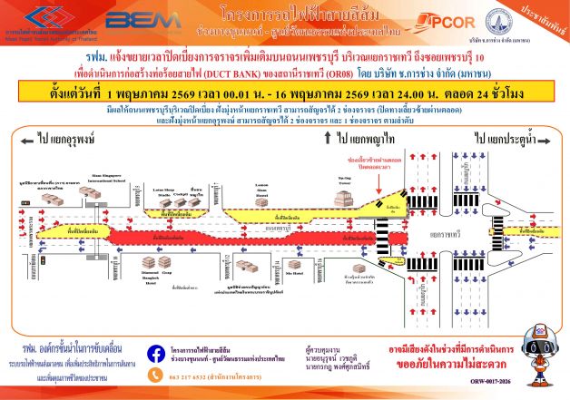 ถึง ซอยเพชรบุรี 10 เพื่อดำเนินการก่อสร้างท่อร้อยสายไฟ (DUCK BANK) ของสถานีราชเทวี (OR08) ตั้งแต่วันที่