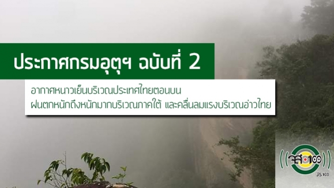 ประกาศกรมอุตุนิยมวิทยา 'อากาศหนาวเย็นบริเวณประเทศไทยตอนบน ฝนตกหนักถึงหนักมากบริเวณภาคใต้ และคลื่นลมแรงบริเวณอ่าวไทย' ฉบับที่ 2