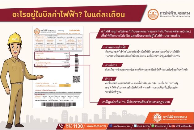 อย่างไรก็ตาม หากผู้ใช้ไฟฟ้ามีข้อสงสัยเกี่ยวกับอัตราค่าไฟฟ้าสามารถศึกษารายละเอียดเพิ่มเติมทั้งหมดผ่านช่องทางเว็บไซต์การไฟฟ้านครหลวง www.mea.or.th หรือสอบถามข้อมูลอื่น ๆ เพิ่มเติมเกี่ยวกับอัตราค่าไฟฟ้าได้ที่ MEA Call Center โทร. 1130 ได้ตลอด 24 ชั่วโมง