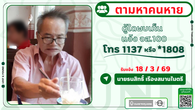 คนหายมีอาการทางจิตเวช หายจากซอยที่ดินทอง 6 สำโรง จ.สมุทรปราการ ผู้ใดพบเห็นแจ้ง JS100 โทร *1808 หรือ 1137