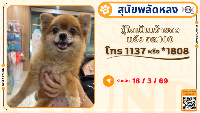 สุนัขหายจากบ้านย่าน อ.ปากเกร็ด จ.นนทบุรี ผู้ใดพบเห็นแจ้ง JS100 โทร *1808 หรือ 1137