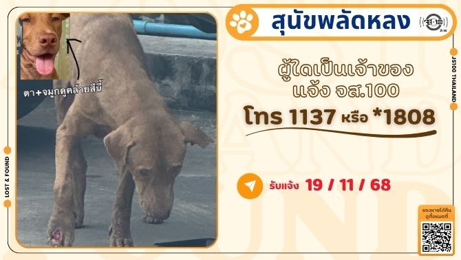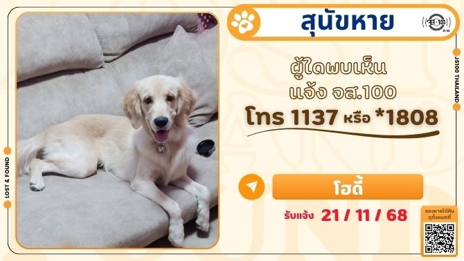 สุนัขหายจากโรงพยาบาลสัตว์กิ่งแก้ว ซ.กิ่งแก้ว 36 อ.บางพลี จ.สมุทรปราการ ผู้ใดพบเห็นแจ้ง JS100 โทร *1808 หรือ 1137