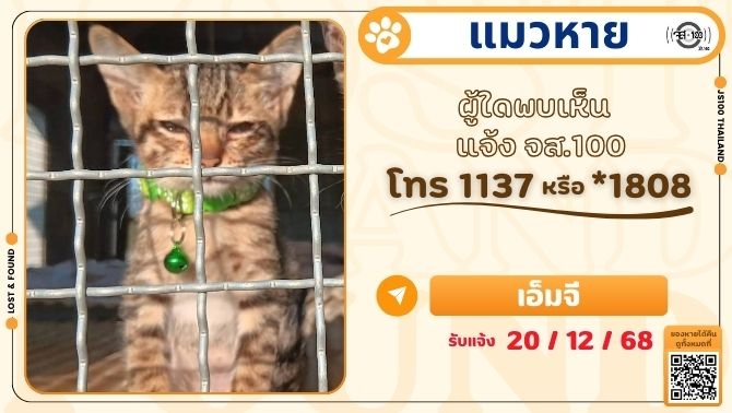 แมวหายจากบ้าน ต.ป่าไผ่ อ.สันทราย จ.เชียงใหม่ ผู้ใดพบเห็นแจ้ง JS100 โทร *1808 หรือ 1137