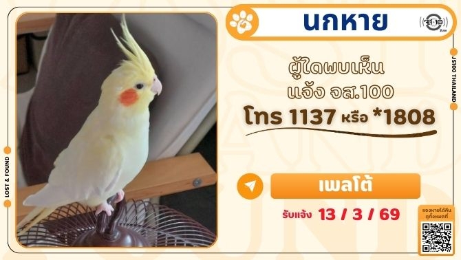 นกหายจากซอยบางขุนนนท์ 16 เขตบางกอกน้อย ผู้ใดพบเห็นแจ้ง JS100 โทร *1808 หรือ 1137