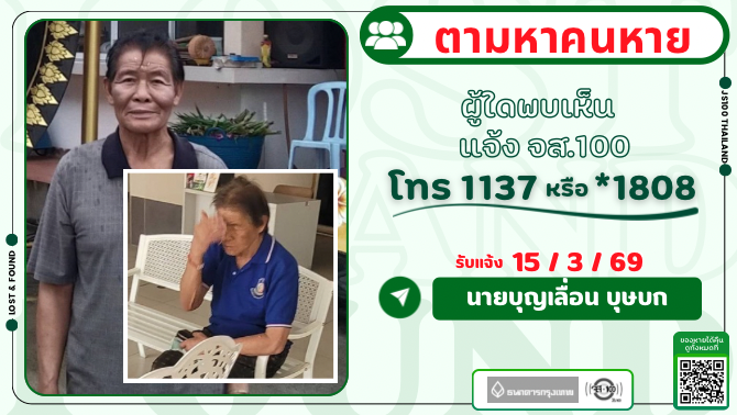 ชายชรามีอาการหลงลืม หายจากบ้านย่านวังหลัง ศิริราช เขตบางกอกน้อย ผู้ใดพบเห็นแจ้ง JS100 โทร *1808 หรือ 1137