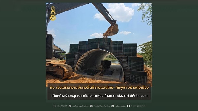 ทบ. เร่งเสริมความมั่นคงพื้นที่ชายแดนไทย–กัมพูชา เดินหน้าสร้างหลุมหลบภัย 182 แห่ง