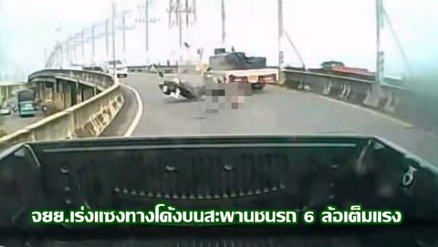 คลิปที่ 10527 อุบัติเหตุมอเตอร์ไซต์ขี่แซงบนสะพานข้ามนิคมฯโรจนะ จนไปชนกับรถ 6 ล้อ (3 ก.ย. 68)
