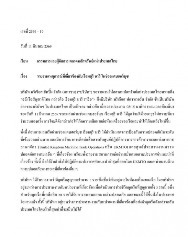 บริษัท พรีเชียส ชิพปิ้ง จำกัด (มหาชน) หรือ PSL ทำหนังสือรายงานต่อตลาดหลักทรัพย์แห่งประเทศไทย (ตลท.) ถึงกรณี เรือ “มยุรี นารี” เรือสัญชาติไทย ซึ่งมีบริษัท พรีเชียส ฟลาวเวอร์ส จำกัด ซึ่งเป็นบริษัทย่อยของบริษัทฯ ในประเทศไทย เป็นเจ้าของ ถูกโจมตีขณะแล่นผ่านช่องแคบฮอร์มุซ เมื่อวันที่ 11 มีนาคม 2569 เวลาประมาณ 08.15 น. ตามเวลาท้องถิ่น โดยถูกโจมตีด้วยอาวุธไม่ทราบที่มา จำนวนสองครั้ง ทำให้ห้องเครื่องของเรือเสียหายและเกิดเพลิงไหม้ขึ้น