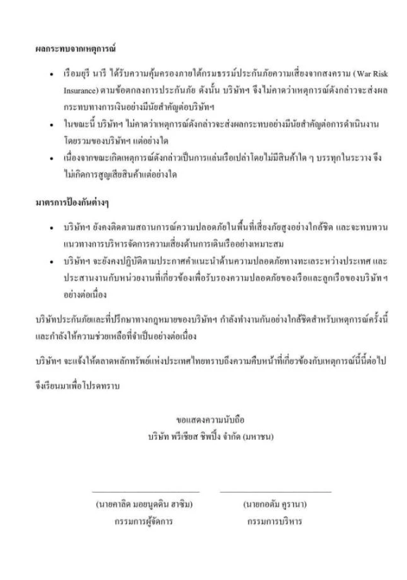 ทั้งนี้ บริษัทระบุว่าจะติดตามสถานการณ์ด้านความปลอดภัยในพื้นที่เสี่ยงสูงอย่างใกล้ชิด พร้อมทบทวนมาตรการบริหารความเสี่ยงด้านเส้นทางเดินเรือ รวมถึงยังคงปฎิบัติตามคำแนะนำด้านความปลอดภัยทางทะเลระหว่างประเทศ พร้อมระบุว่าบริษัทประกันภัยและที่ปรึกษาทางกฎหมายของบริษัทฯ กำลังทำงานกันอย่างใกล้ชิดสำหรับเหตุการณ์ครั้งนี้ และกำลังให้ความช่วยเหลือที่จจำเป็นอย่างต่อเนื่อง และจะรายงานความคืบหน้าของเหตุการณ์ให้ตลาดหลักทรัพย์ฯ ทราบต่อไป